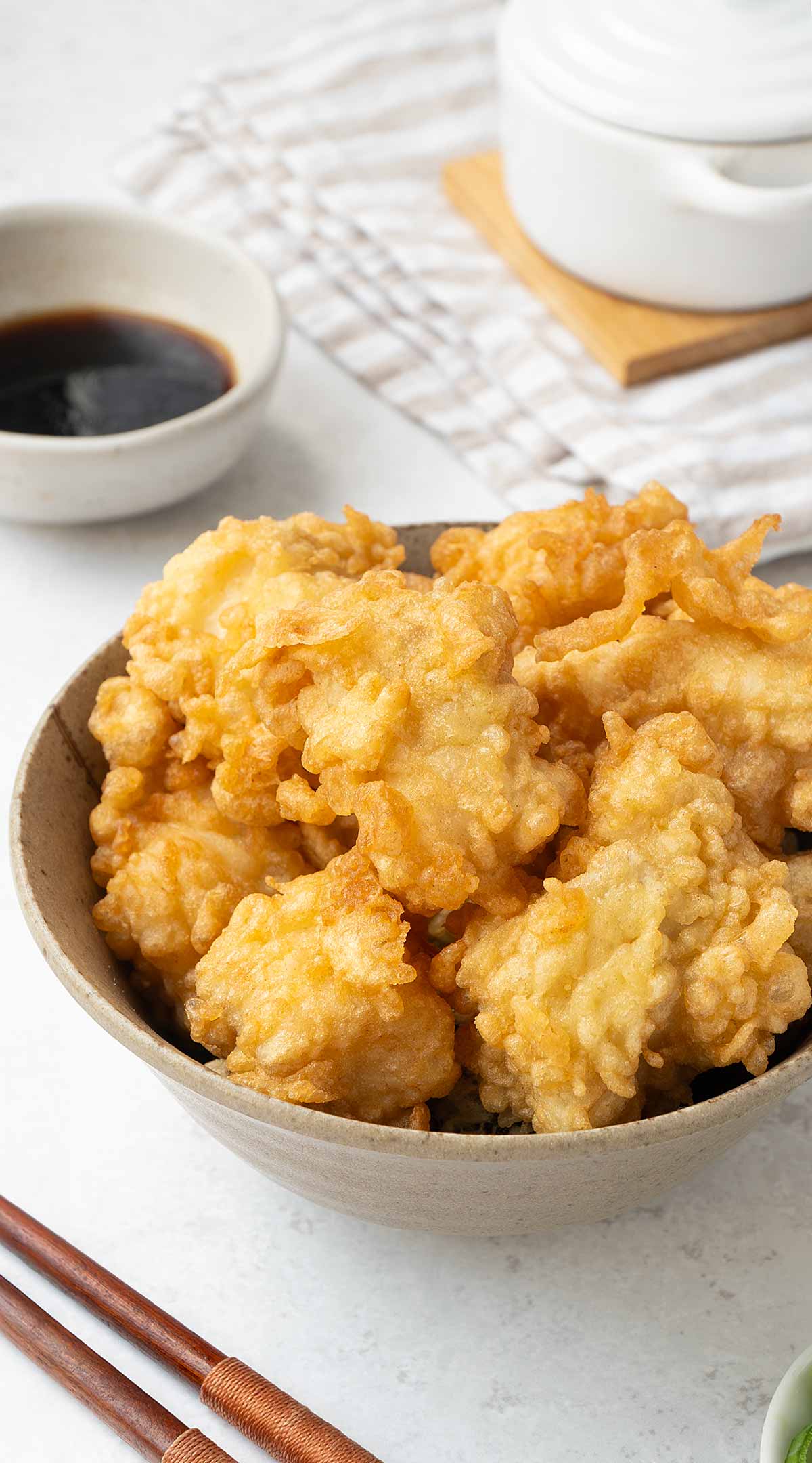 This Japanese batter is very light and gives a delicate crunch without feeling heavy or greasy. We usually serve it with warm rice or udon noodle soup, along with a simple soy-ginger dipping sauce.